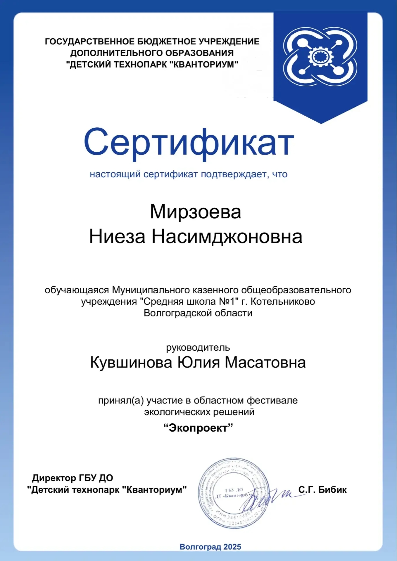 Ученица 8 "А" класса Пирожик Анастасия приняла участие в проводимом с 15 января по 31 января 2024 года государственным бюджетным учреждением дополнительного образования "Детский технопарк "Кванториум" областном фестивале "Экопроект". На конкурсный блок Фестиваля была представлена работа, исследовательский проект "Переутомление. Биохимическая диагностика процесса переутомления". Пирожик Анастасия получила сертификат участника областного Фестиваля.