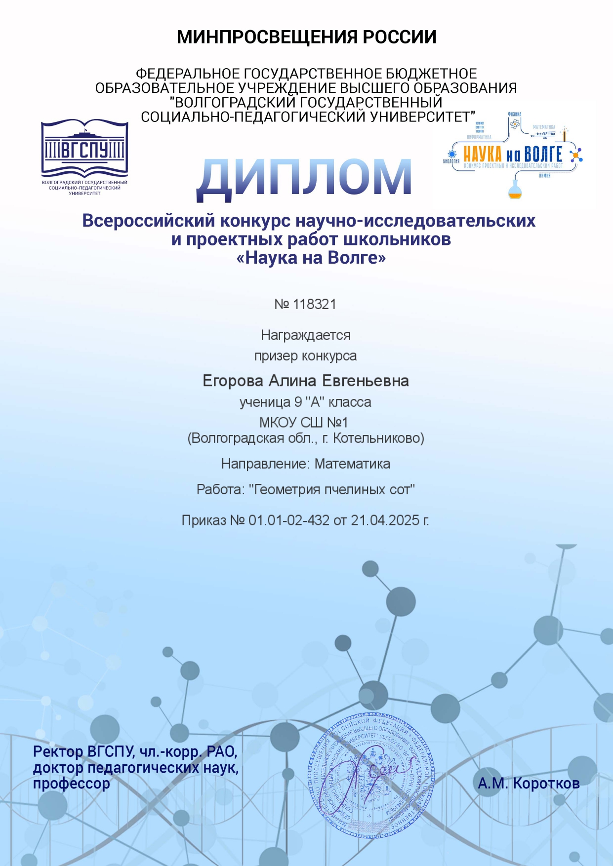 Учащиеся нашей школы: Остапенко Максим (10 класс) и Егорова Алина (9 "А" класс) приняли участие во Всероссийский конкурсе научно-исследовательских и проектных работ школьников «Наука на Волге». Более 120 старшеклассников из 24 регионов страны представили на конкурс свои работы по пяти направлениям.Конкурс проходил в 2 этапа по пяти школьным предметам: математика физика, информатика, химия, биология. В заочном этапе приняли участие более 300 школьников, в финале, на площадке ВГСПУ, свои работы защищали 125 финалистов из 24 регионов России. Егорова Алина с проектной работой "Геометрия пчелиных сот" вышла в финальный очный тур конкурса, защитила свою работу и стала призером этого всероссийского конкурса. Поздравляем наших учащихся и желаем дальнейших побед!