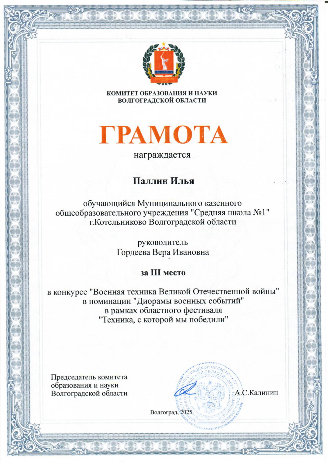 «Техника, с которой мы победили» - творческий конкурс-фестиваль Волгоградского технопарка Кванториум. Участники конкурса воссоздают прототипы моделей военной техники В 2025 году на этом областном фестивале в конкурсе «Военная техника ВОВ» в номинации «Диорамы военных событий» Паллин Илья, учащийся 11 класса, представил прототип знаменитого танка Т-34. Работа выполнена из пластилина. По итогам областного фестиваля Илья получил грамоту комитета образования и науки Волгоградской области за 3 место.