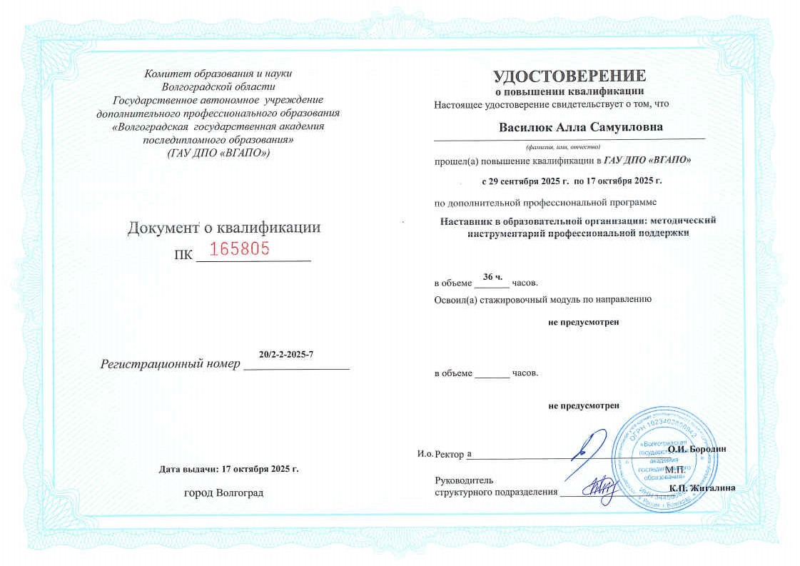 Удостоверение А.С. Василюк о прохождении курсов повышения квалификации по дополнительной профессиональной программе "Наставник в образовательной организации: методический инструментарий профессиональной поддержки", 36 ч, ГАУ ДПО "ВГАПО"