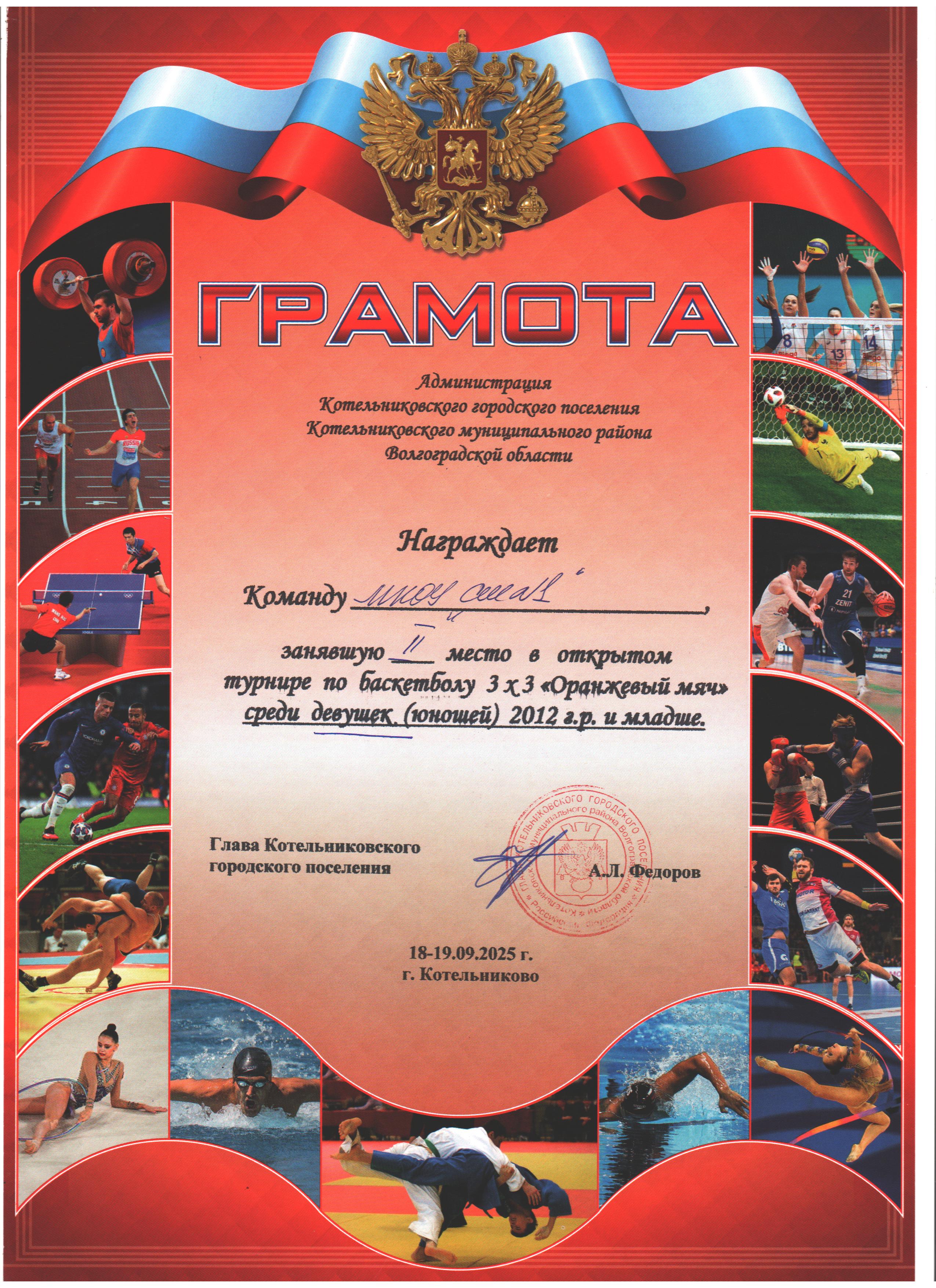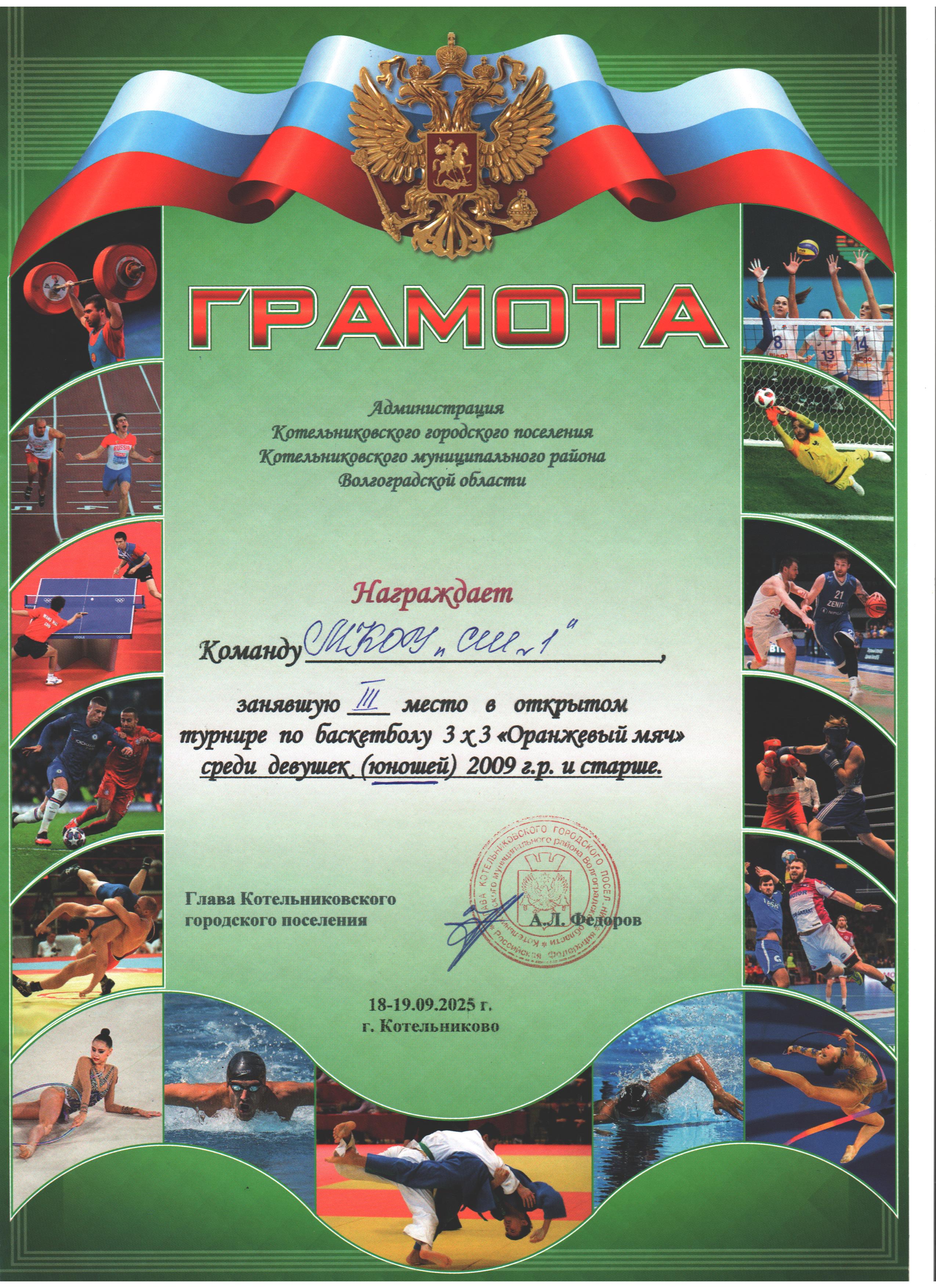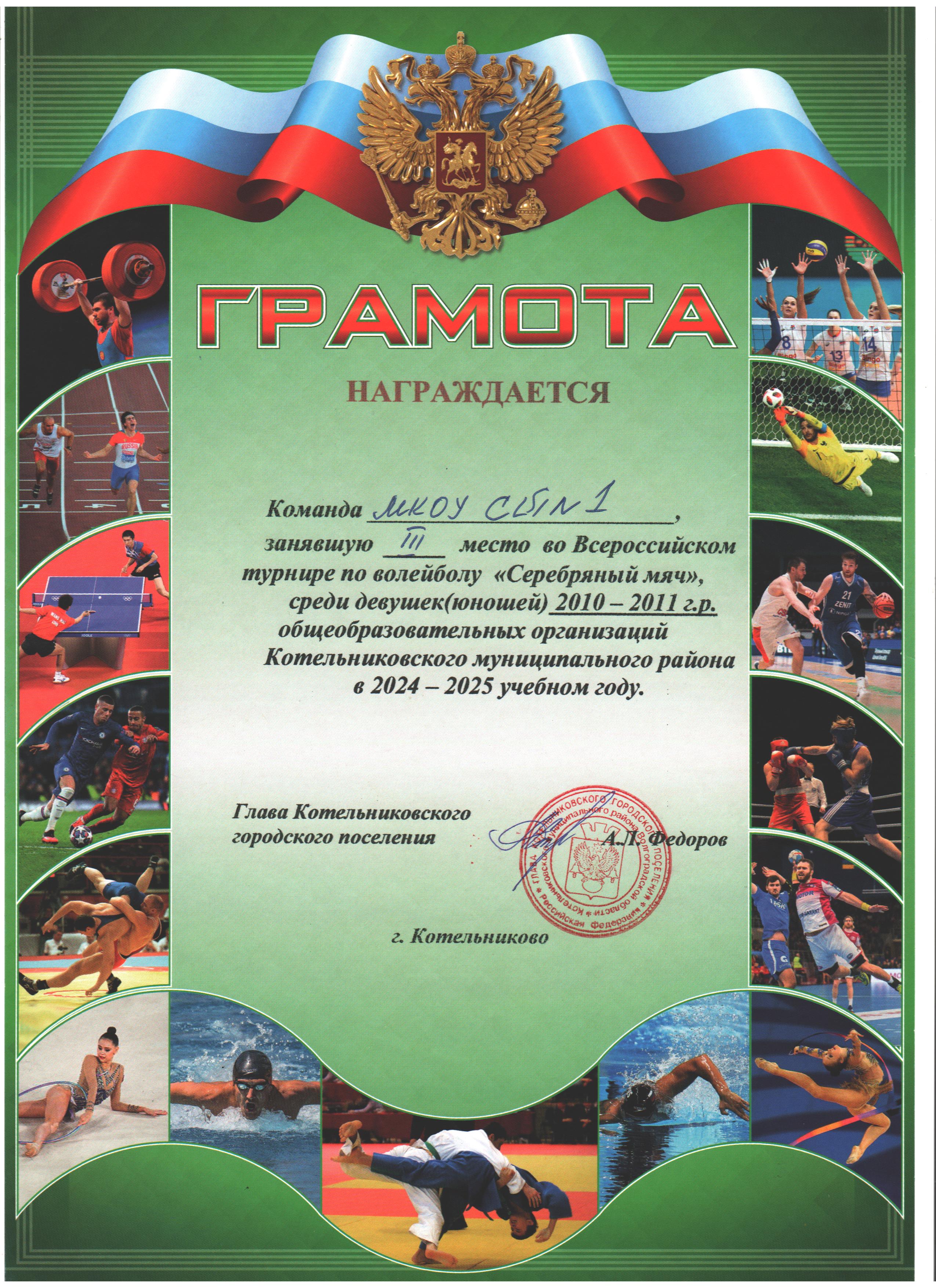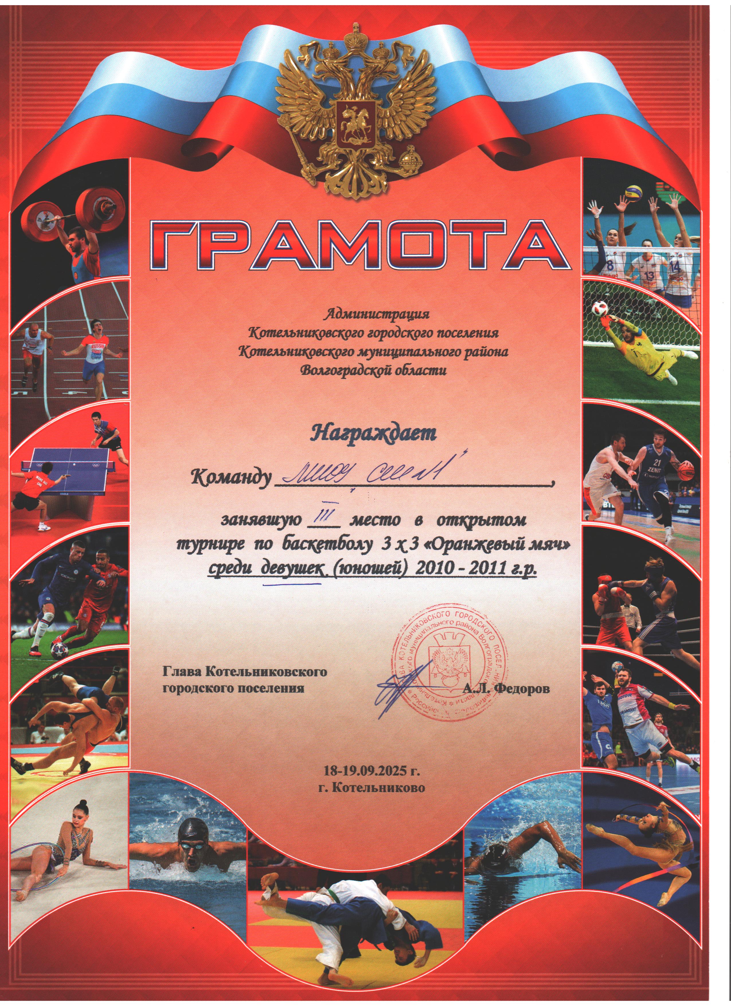 | 3 место в XXXII районном легкоатлетическом кроссе на Кубок С. Разина | 3 место в открытом турнире по баскетболу 3х3 "Оранжевый мяч" среди девушек 2009-2010 г.р. | 3 место во Всероссийском турнире по волейболу "Серебряный мяч" среди девушек (юношей) 2010-2011 г.р.общеобразовательных организаций Котельниковского муниципального района |