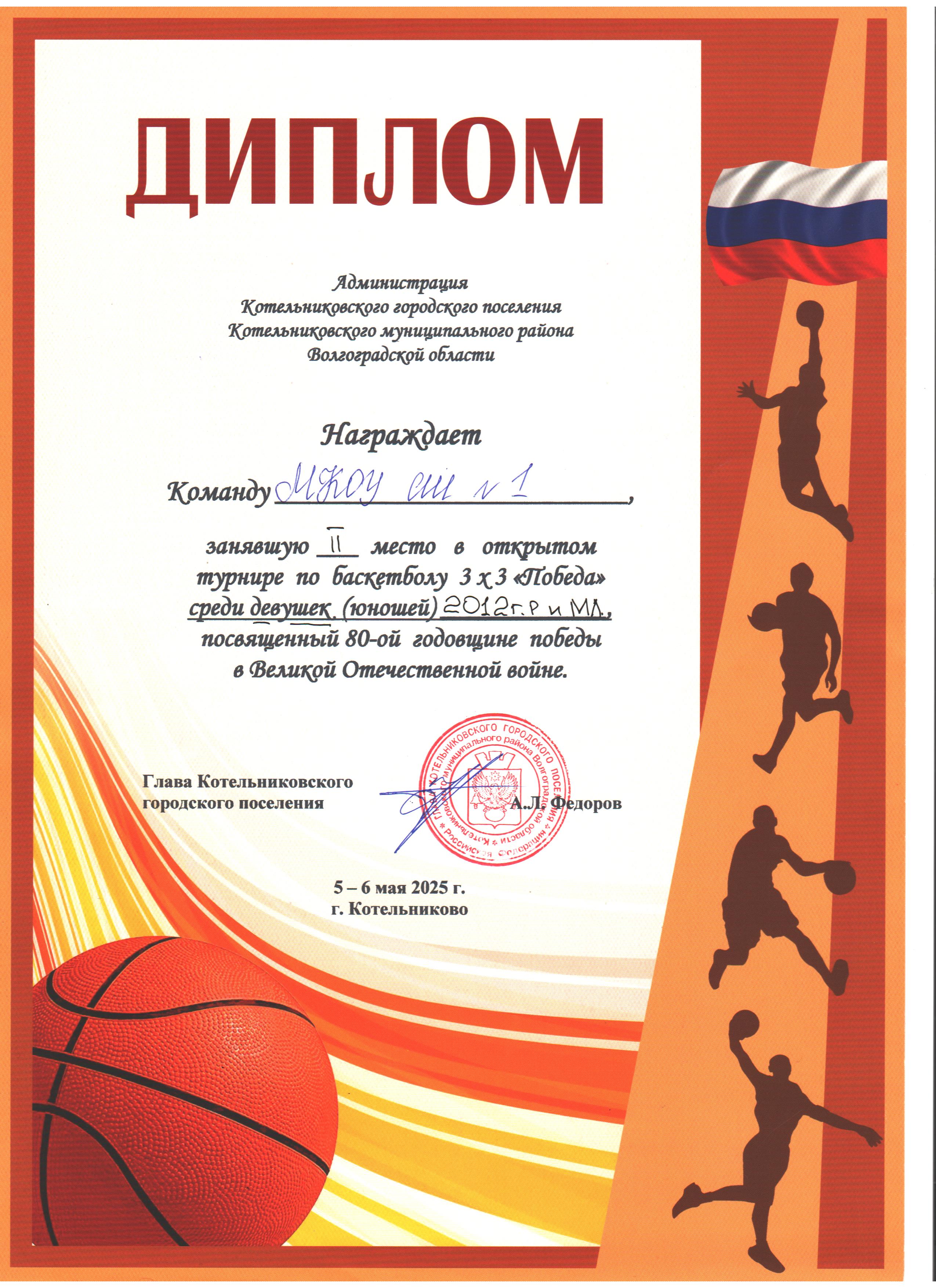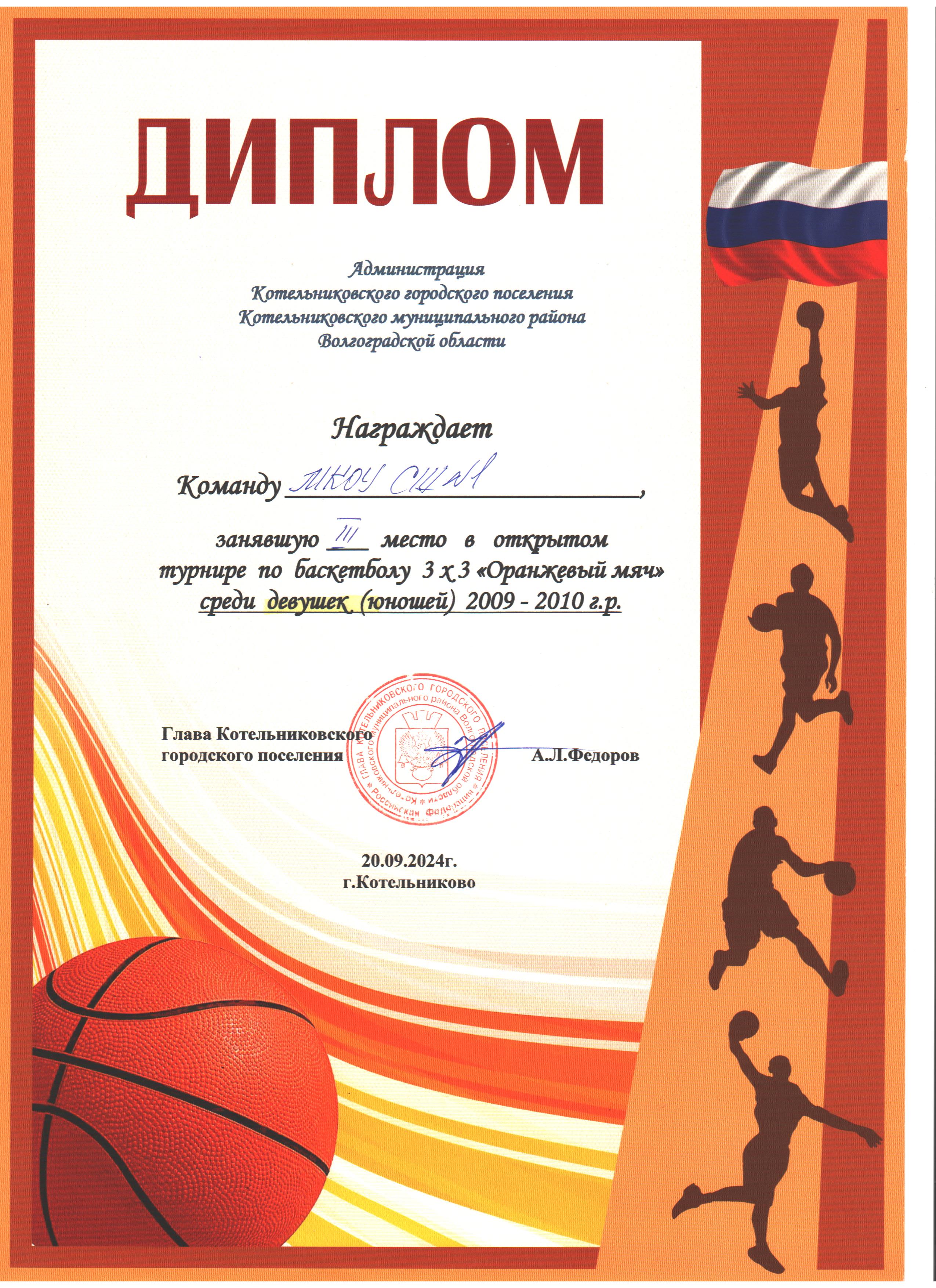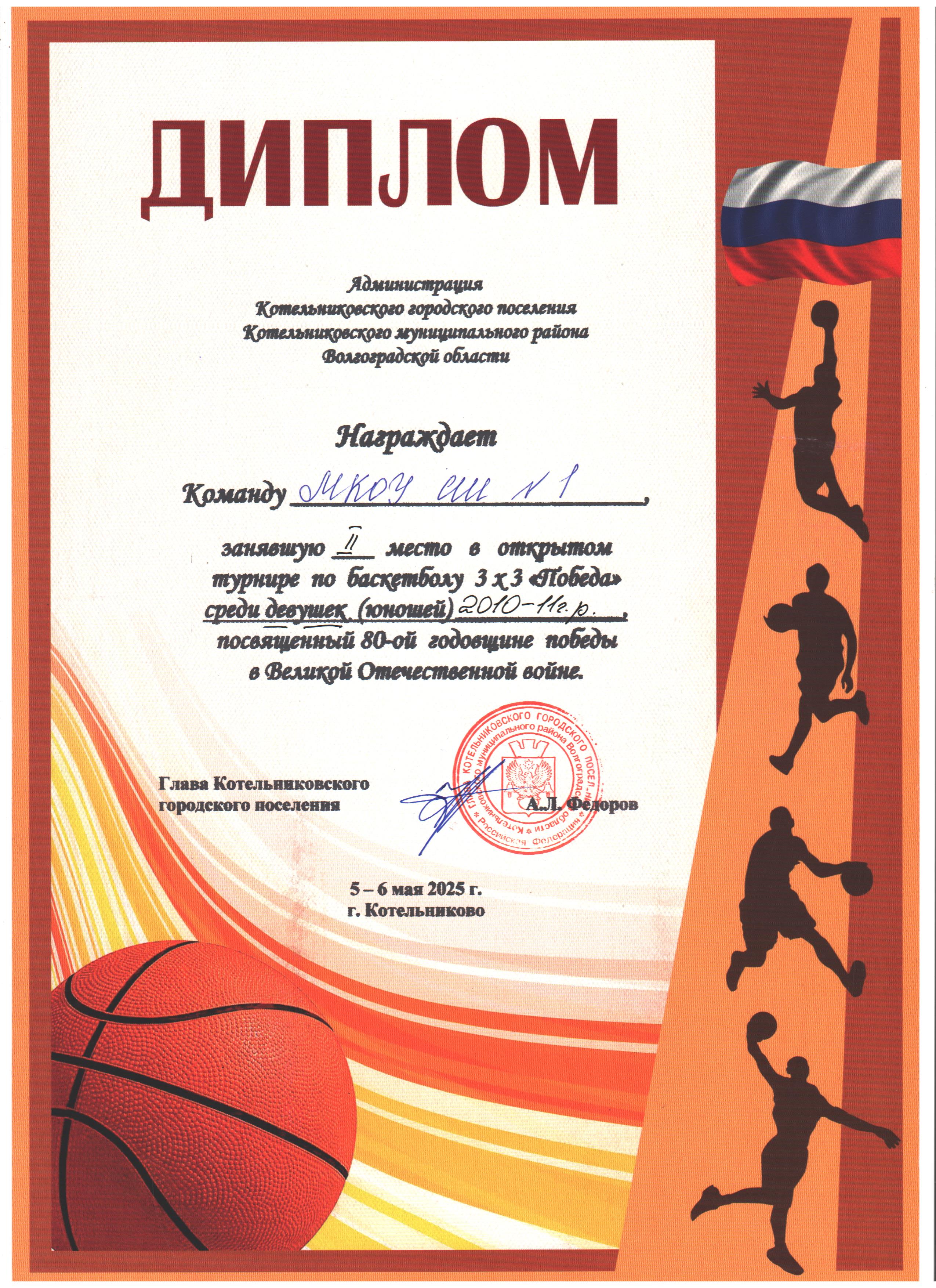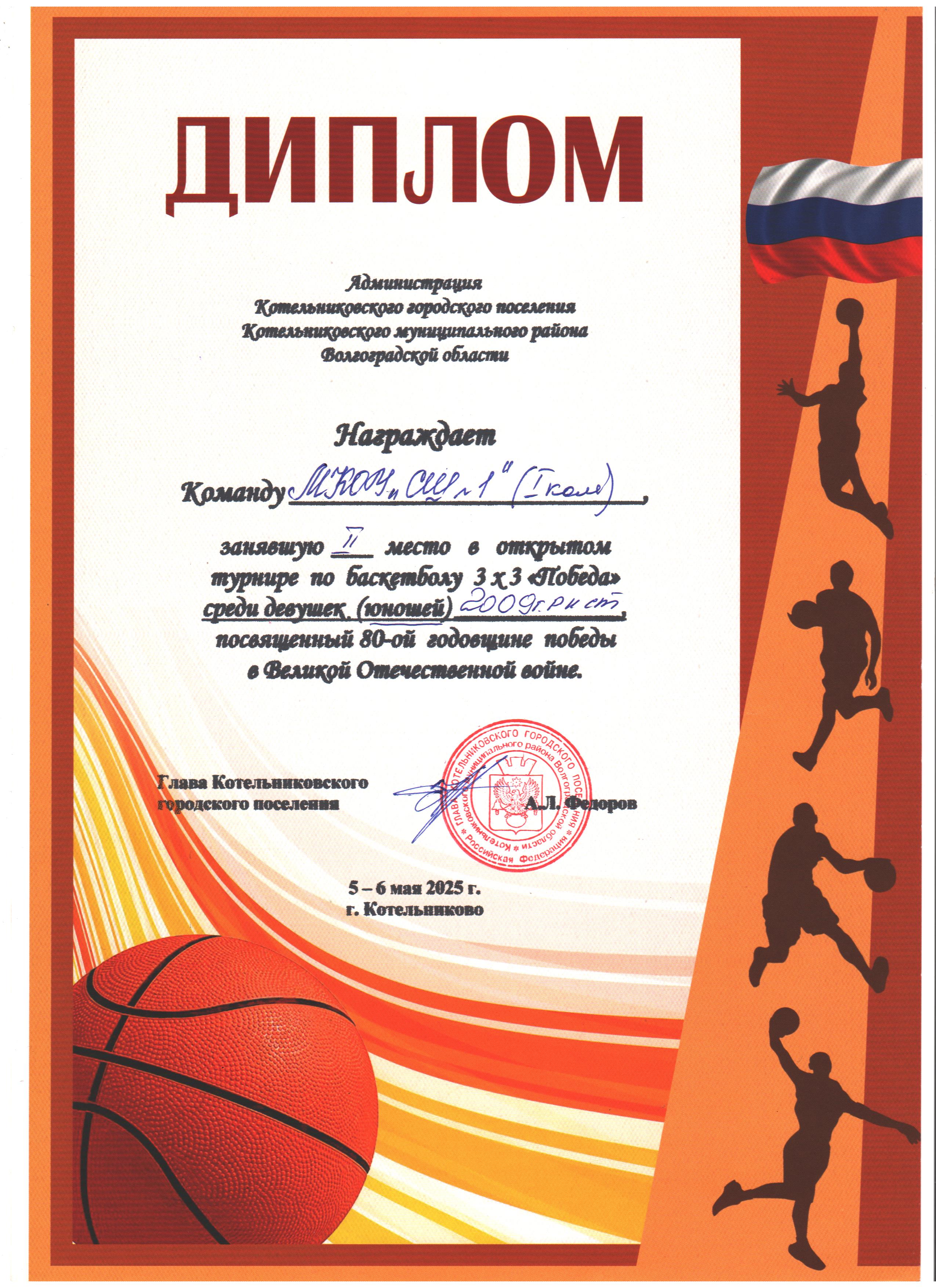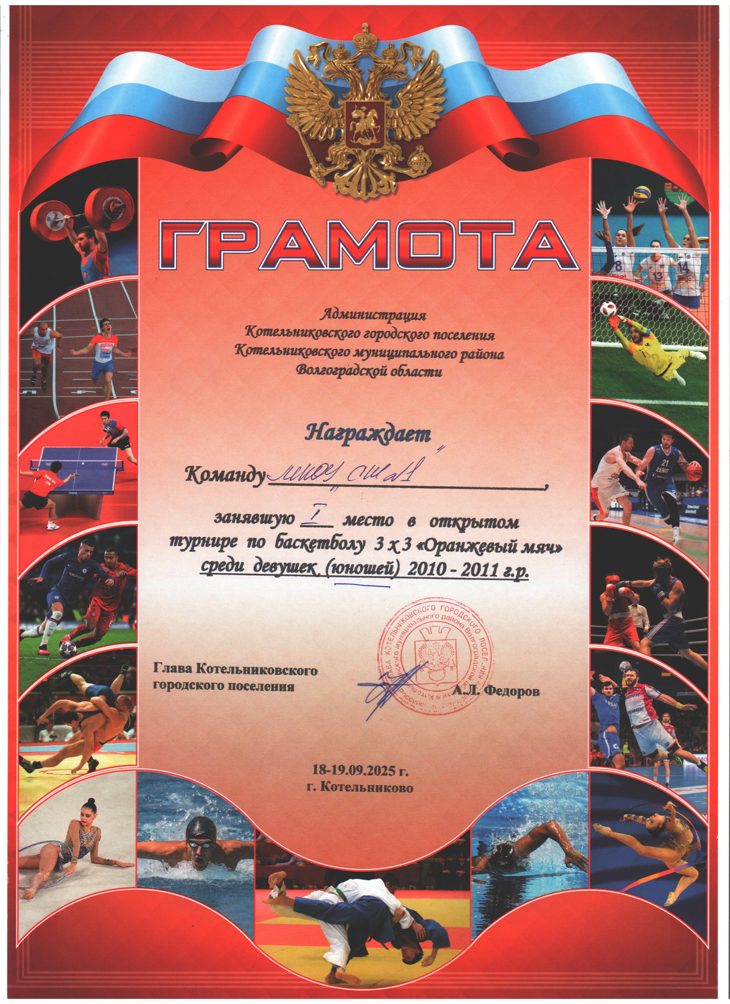 | 3 место в XXXII районном легкоатлетическом кроссе на Кубок С. Разина | 3 место в открытом турнире по баскетболу 3х3 "Оранжевый мяч" среди девушек 2009-2010 г.р. | 3 место во Всероссийском турнире по волейболу "Серебряный мяч" среди девушек (юношей) 2010-2011 г.р.общеобразовательных организаций Котельниковского муниципального района |