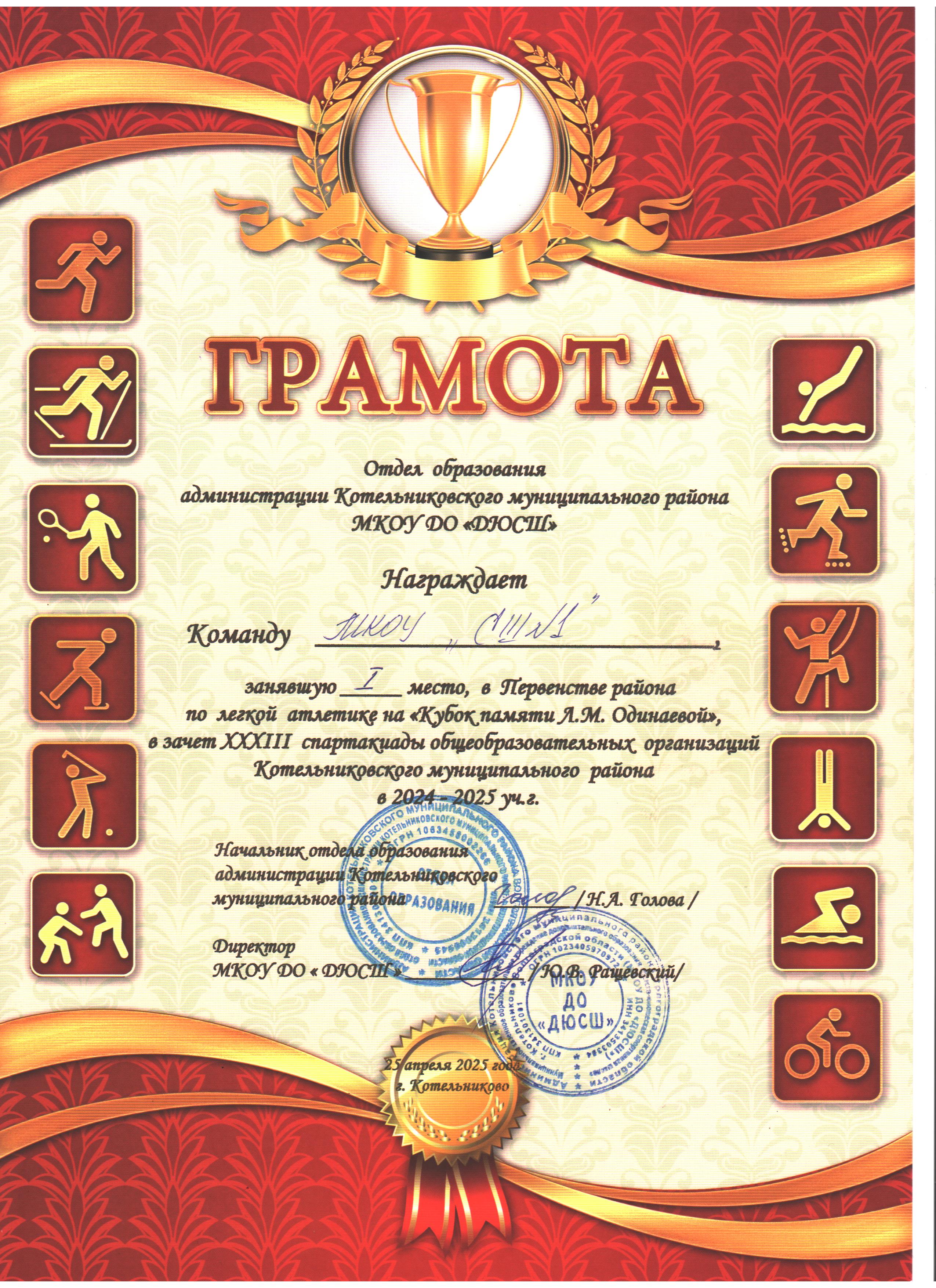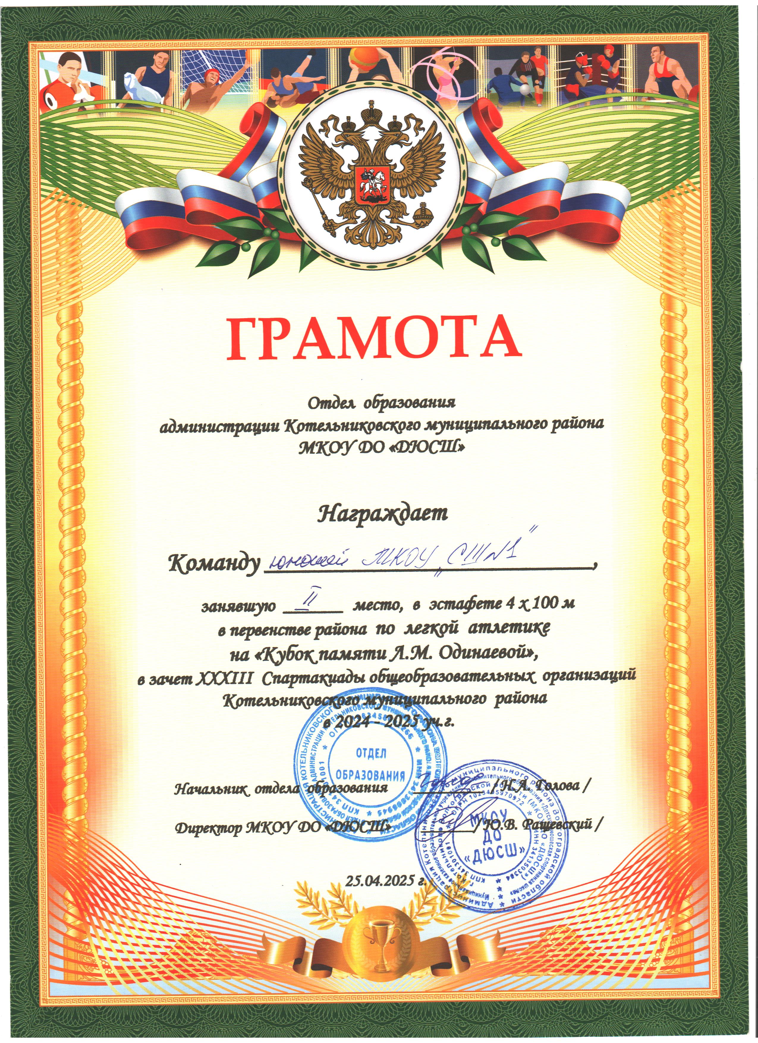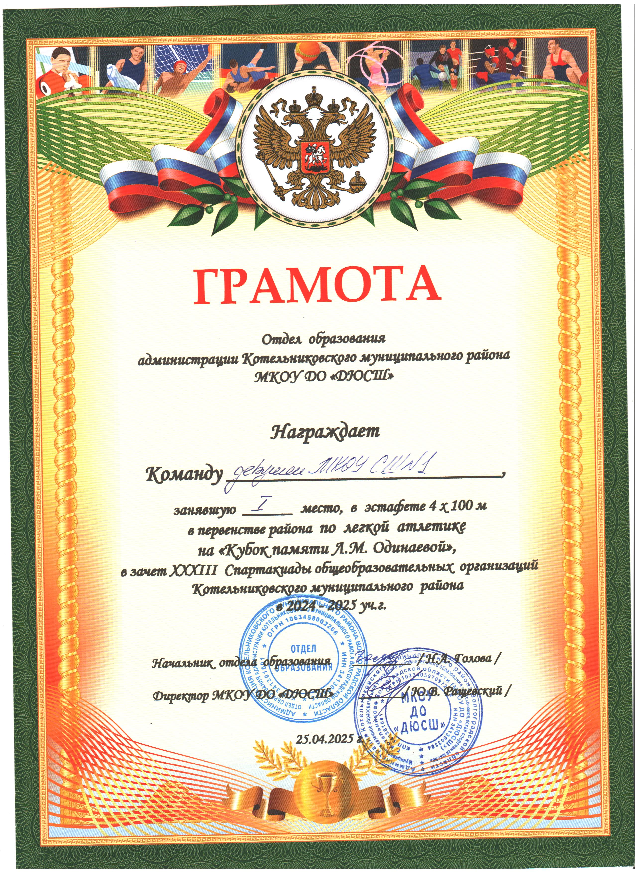 Первенство района по легкой атлетике на "Кубок памяти Л.М. Одинаевой" в зачет XXXIII спартакиады общеобразовательных организаций Котельниковского муниципального района в 2024-2025 учебном году.