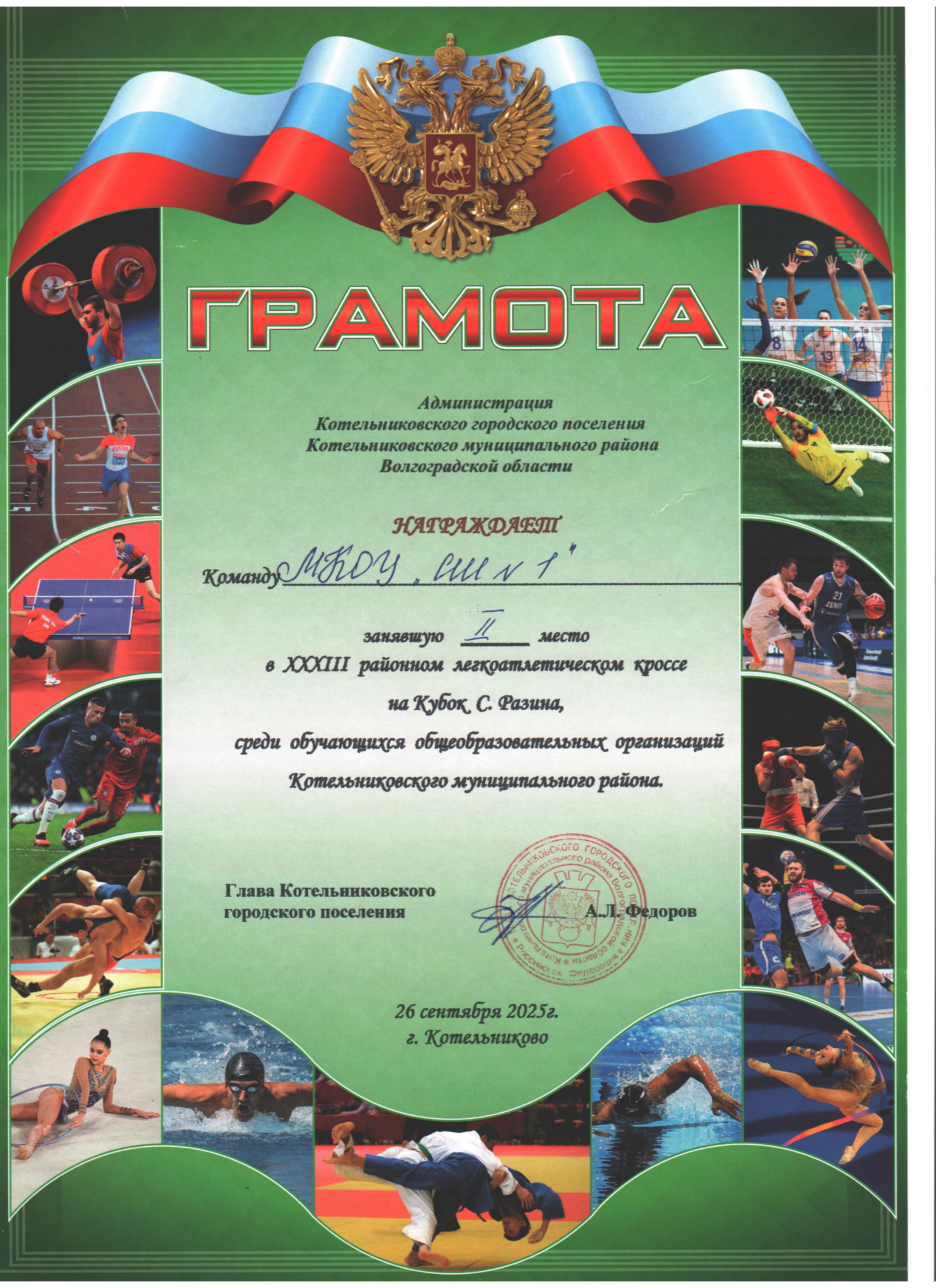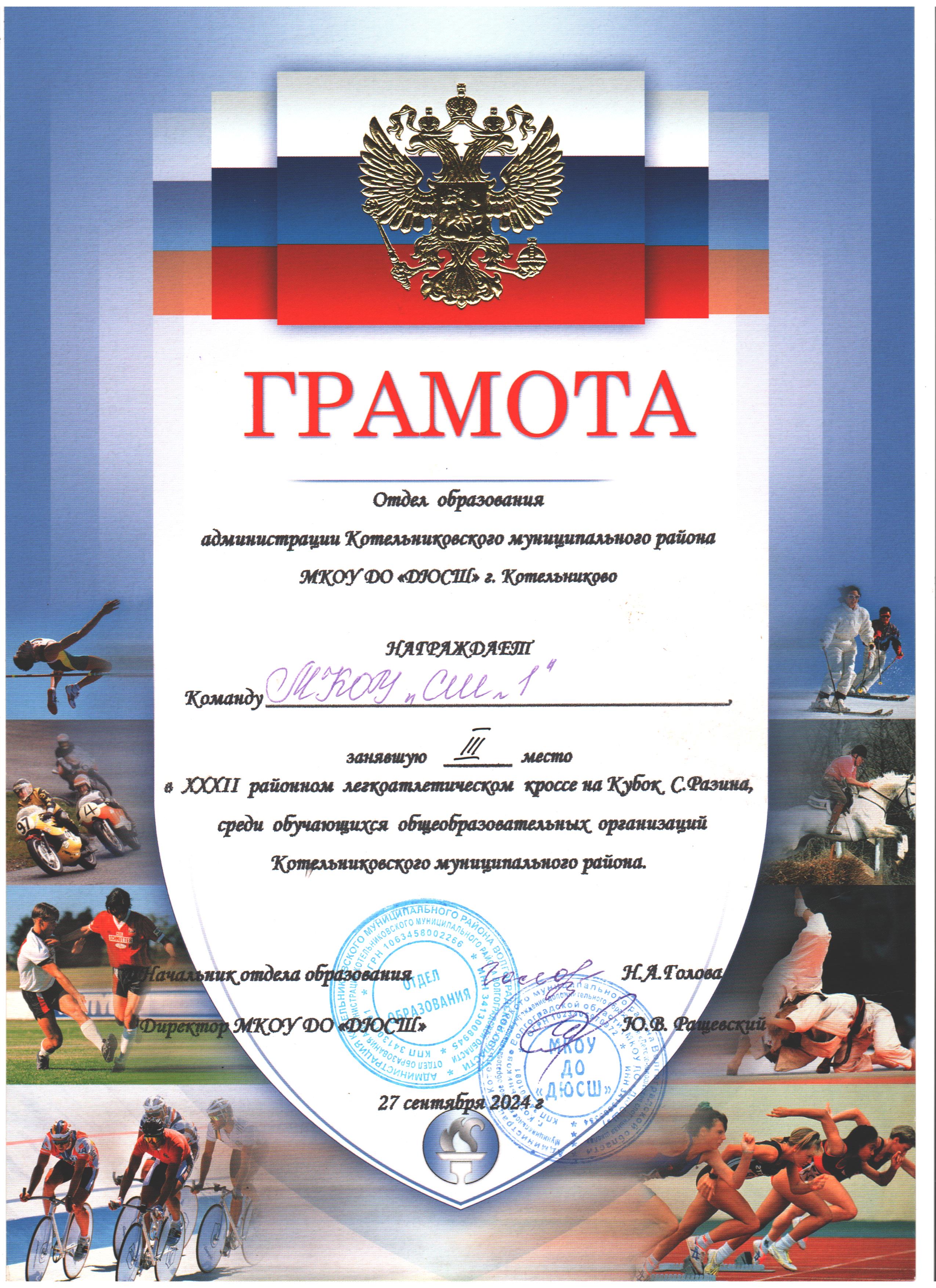XXXIII районный легкоатлетический кросс на кубок С.Разина среди обучающихся общеобразовательных организаций Котельниковского муниципального района. 2 место