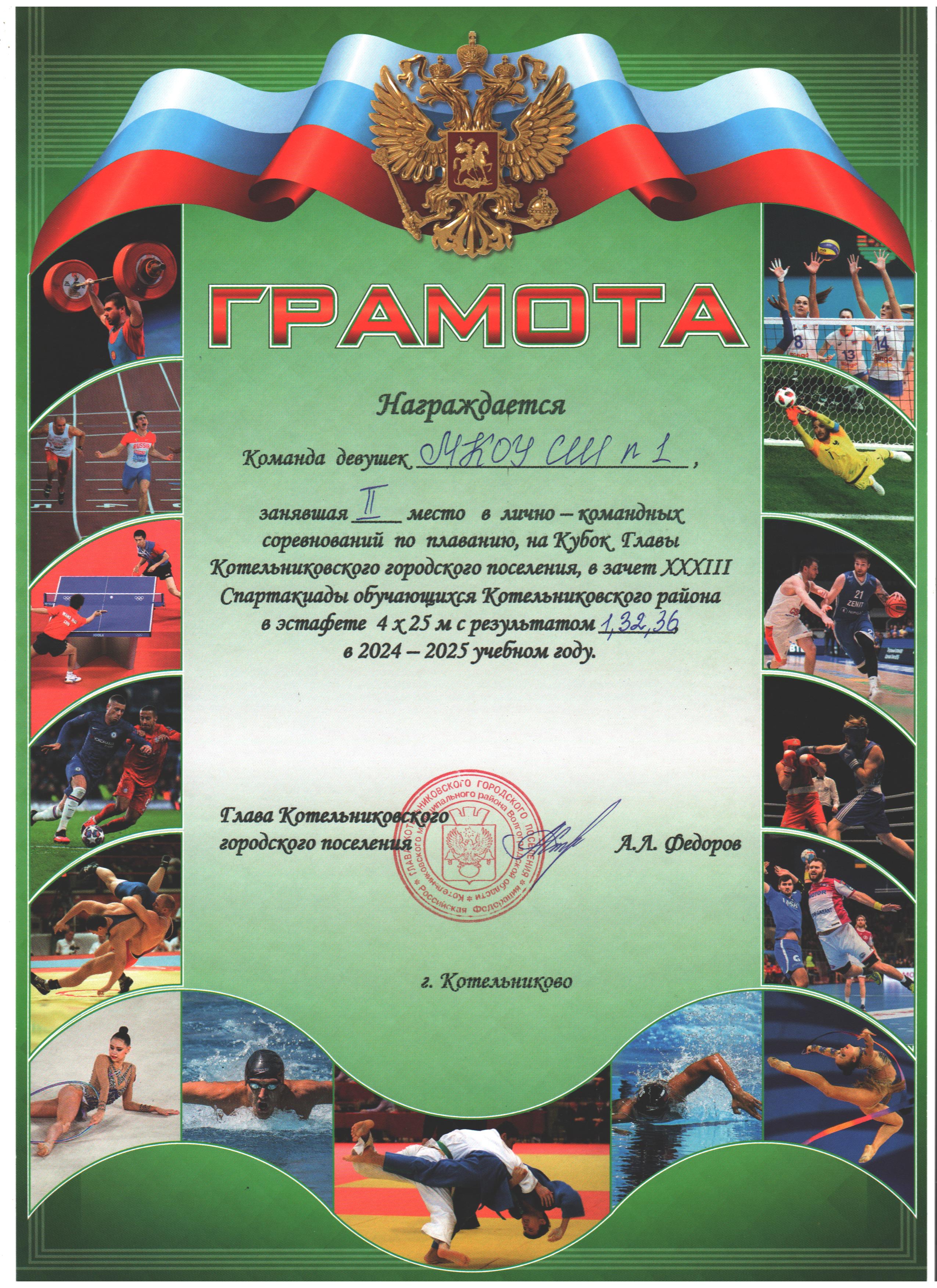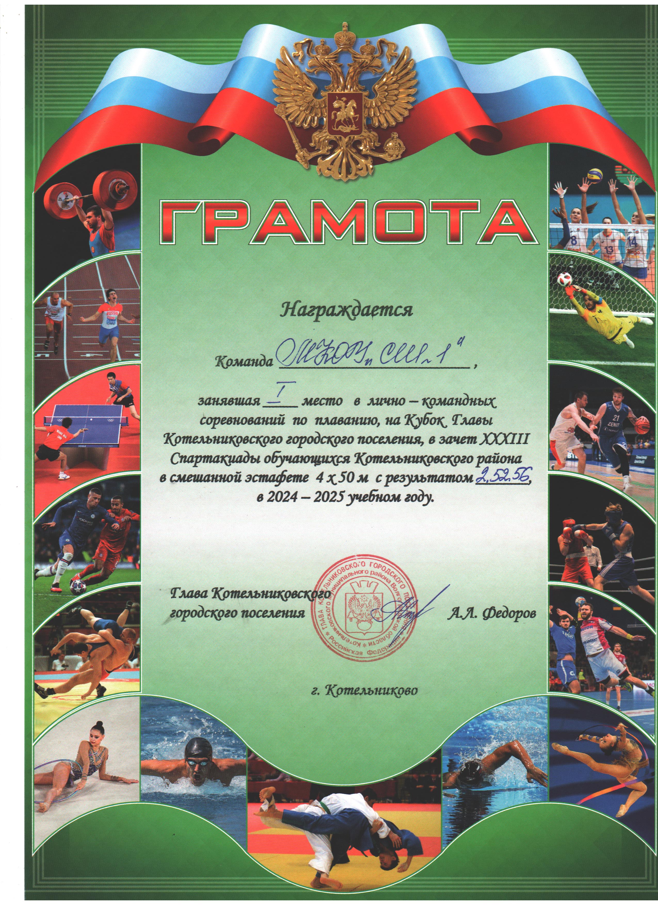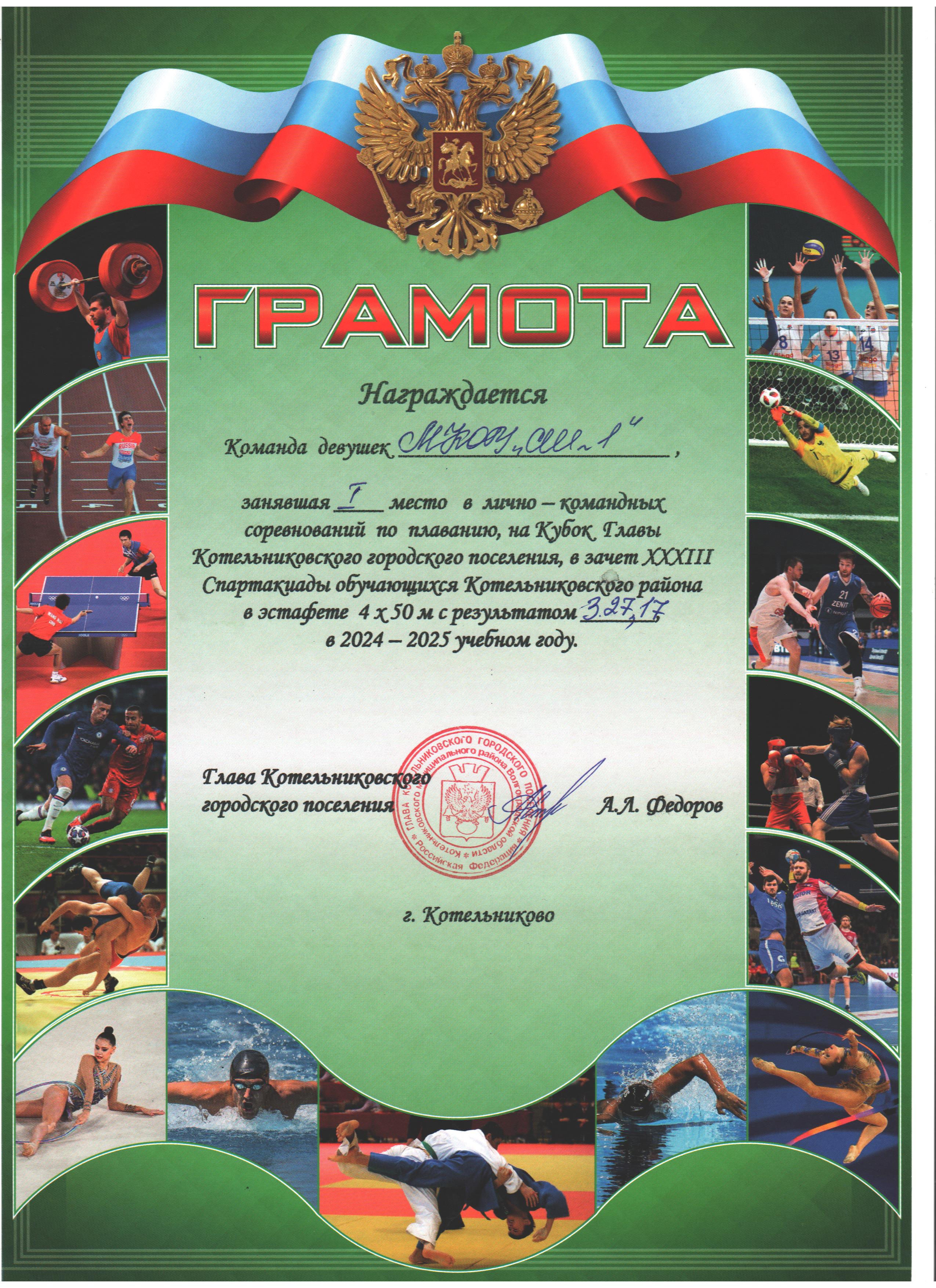 | 1 место | 1 место среди девушек в эстафете 4х50 м | 1 место в смешанной эстафете 4х50 м | 2 место среди юношей в эстафете 4х50 м | 2 место среди девушек в эстафете 4х25 м |